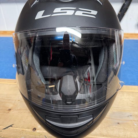 Motorsykkelhjelm. Følger med ekstra visir. Noen bruksmerker og lukter litt parfyme... Str XL