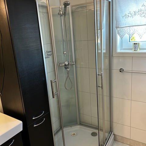 Dusjkabinett med massasjedyser og dusjpanel og steam hvit