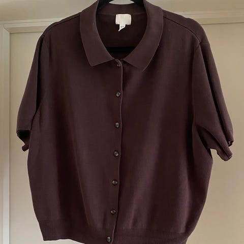 LT Sport Petite Large topp. Vintage 90s. 90% polyester, 10% Lycra spandex. Made in Korea. Kortermet modell med krage og knappestolpe foran. Toppen er i lilla fløyelsmateriale. Veldig komfortabel! Ekstra knapp.