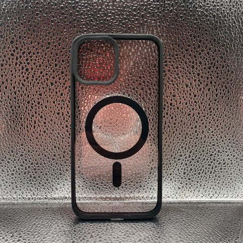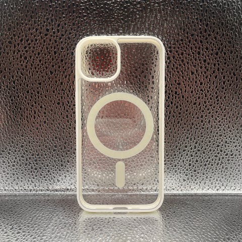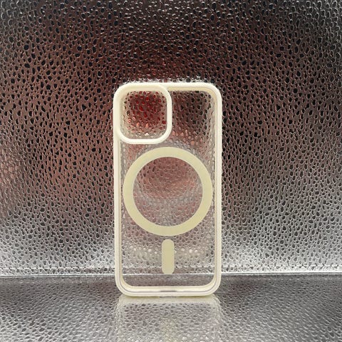 Gjennomsiktig MagSafe deksel med hvit ramme til iPhone 12 Pro Max selges.