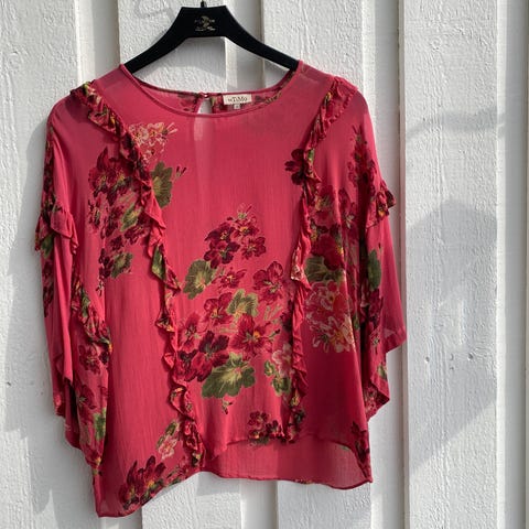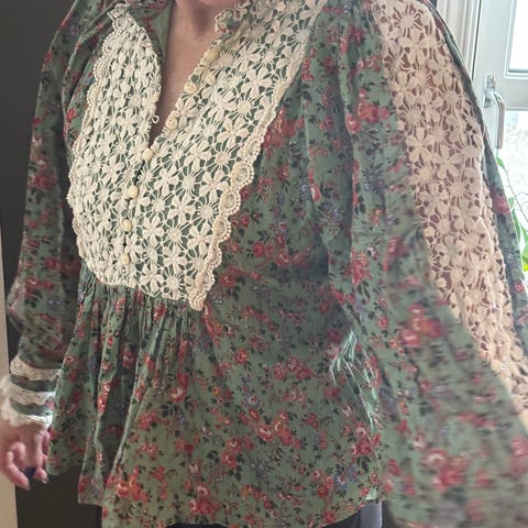byTiMo bluse i grønn farge med småblomstret mønster i str M. Blusen har lange ermer med rynkedetaljer ved mansjettene, volanger langs skuldrene og knappelukking foran. Vid og løs passform med rynker fra livet og ned gir et lett og fallende uttrykk. Passer til hverdagsbruk eller mer pyntede anledninger avhengig av styling.
