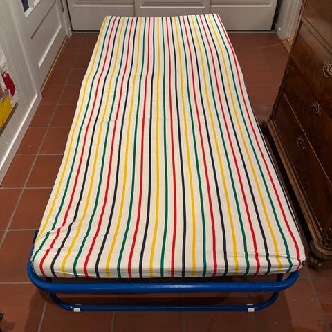 IKEA sammenleggbar gjesteseng med madrass. Madrassen følger med og har stripete trekk i flere farger. Sengen kan slås sammen for enkel oppbevaring når den ikke er i bruk, og egner seg som ekstra seng eller gjesteseng i hjemmet, på hytta eller i andre rom med begrenset plass.