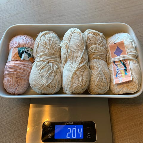 Garnnøster i blandede lyse farger. Bildene viser flere nøster i hvit, krem, lys rosa og lys fersken. Hvert nøste er veid enkeltvis på kjøkkenvekt, med vekt rundt 45–50 gram per nøste. Garnet er nøstet opp og klart til bruk til strikke- eller hekleprosjekter som plagg, tilbehør eller interiørartikler. Materiale og garntype er ikke oppgitt.