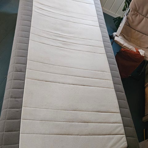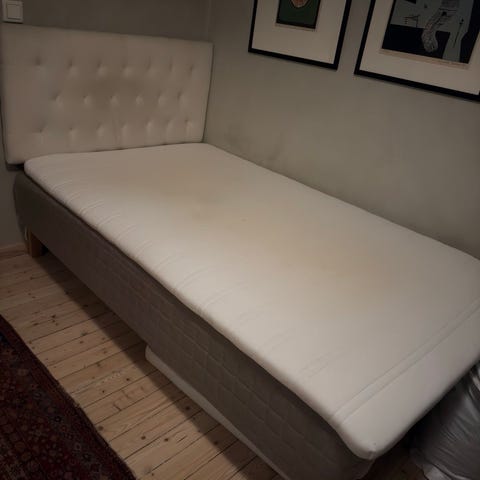 Tar 1000kr for senga, overmadrassen kan fås gratis.