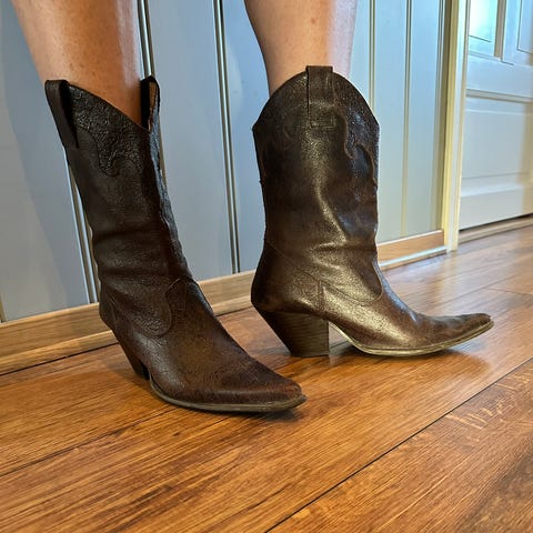 Kjøpt på Tise, brukt av meg en kveld. Litt slitt noen steder og en bulk på ene sko-tuppen.