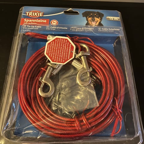 Settet består av en belagt stålvaier med krokfester i begge ender og medfølgende metallfester for å kunne forankre kabelen i underlaget. Egnet for å gi hunden begrenset bevegelsesfrihet utendørs, for eksempel i hage eller på tur der det er behov for å feste hunden sikkert. Kabelen er konstruert for bruk med hundehalsbånd eller sele med standard festering.