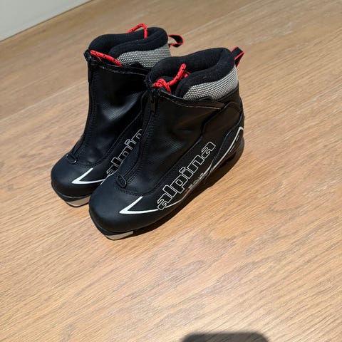 Alpina barneskisko i størrelse 29. Modellen har svart overdel med røde og grå detaljer. Støvlene har snøring med beskyttende glidelåsklaff over vristen. Yttersålen er tilpasset klassisk langrennsbinding (NNN-system).