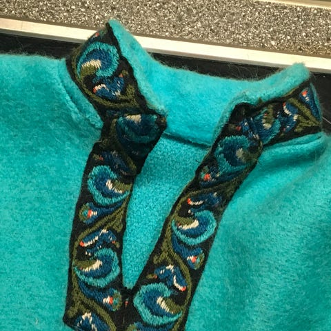 håndlaget poncho fra 60-70-tallet. Hippie. Ull/ullblanding. Deilig petroleumblå bunnfarge. Str S/M.