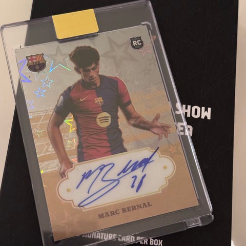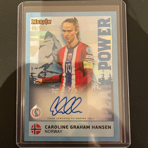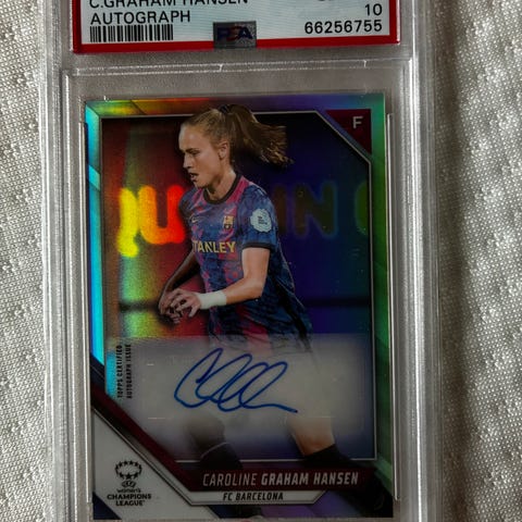 Caroline Graham Hansen 1st Class fotballkort med motiv fra Barcelona. Kortet viser spilleren i Barcelona-drakt og har tekst som beskriver at det inneholder en del av en treningsdrakt fra 2024/25-sesongen. Egnet for samlere av fotballkort og spesielt for dem som samler på Caroline Graham Hansen og Barcelona-relaterte kort.
