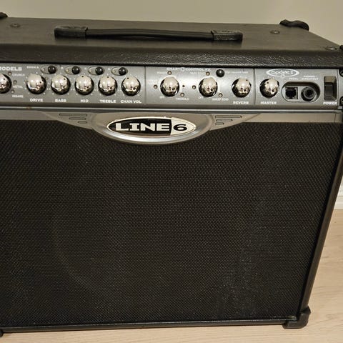 Line 6 Spider II gitarforsterker med to 12" høyttalere i svart kabinett. Forsterkeren har flere innebygde forsterkermodeller og effekter, blant annet phaser, tremolo, tape-eko, sweep-eko og reverb, samt mastervolum og tonekontroller på frontpanelet. På toppen følger det med en Line 6 FBV2 fotbryter for enkel bytting mellom innstillinger. Egnet for elektrisk gitar til øving og bruk i bandrom eller mindre scener.