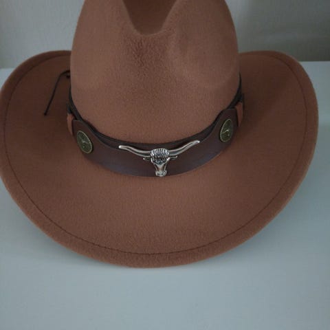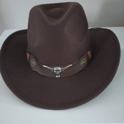 Cowboyhatt for unisex i brun farge. Hatten har bred brem og dekorbånd rundt kronen med metall- og snordetaljer. Innsiden har justerbar snor for bedre passform. Egnet som hodeplagg til hverdagsbruk, kostyme eller temaanledninger.