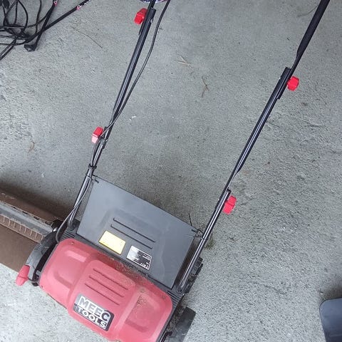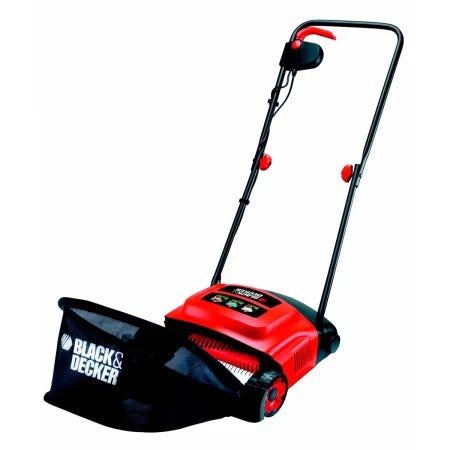 Black & Decker elektrisk plenlufter / mosefjerner i rød farge. Det følger med oppsamlerpose som monteres bak på maskinen for å samle opp rusk fra plenen.