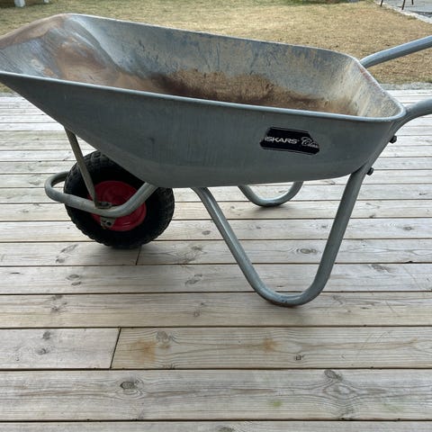 Fiskars trillebår i metall. Trillebåren har galvanisert stålkar, ett lufthjul foran og to benstøtter. Egner seg til transport av jord, hageavfall og annet materiale i hage og uteområde.