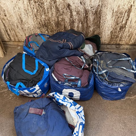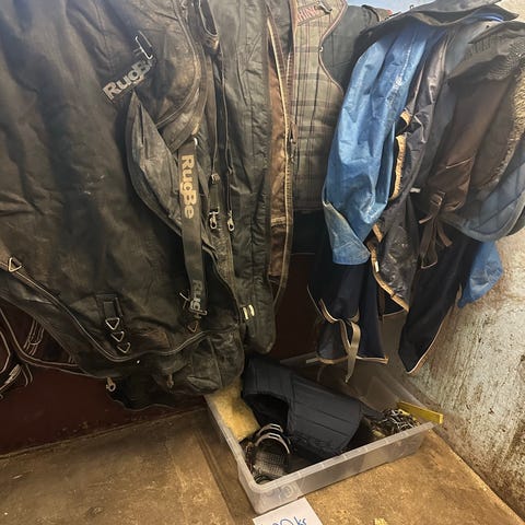 Diverse utstyr til hest, inkludert flere saler, hestetepper/dekken, belegg, hodelag, tøyler og annet lærutstyr. Ulike størrelser og fasonger, egnet til generell ridning og stallbruk. Utstyret ser ut til å omfatte både saltilbehør og hesteutstyr som kan brukes til trening og daglig bruk i stallen. Det selges samlet som et parti med blandet innhold.