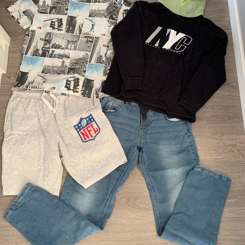 Klespakke str 146/152. Består av en hvit skjorte, en rutete svart skjorte og en dongeribukse/jogger jeans. Skjortene er lite brukt, buksa er litt mer brukt. Selges samlet for 200kr.