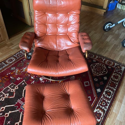 Klassisk Ekornes Stressless i skinn. Klassiker med god sittekomfort. Mangler en knapp. Se bilde. Ingen hull i skinnet / trekket. Må hentes.