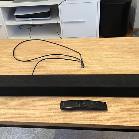 LG soundbar med trådløs subwoofer i svart. Systemet består av lydplanke, trådløs subwoofer og fjernkontroll. Lydplanken har berøringsknapper på toppen for strøm, inngangsvalg, volum og andre funksjoner. Fjernkontrollen gir tilgang til ulike lydmoduser som kino, nattmodus og automatisk på/av. Egnet for bruk sammen med TV eller andre lydkilder via tilgjengelige tilkoblinger på enheten (ikke synlige på bildene).