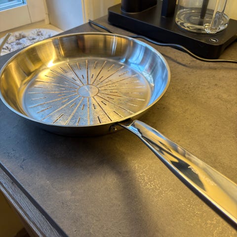 Selger vår Fiskars All Steel keramiske stekepanne på 28 cm. Den funker veldig bra, men har noen bruksmerker som vist på bildene. Vi har forsøkt å vaske den, men lykkes ikke helt, og bruker en annen panne til vanlig.