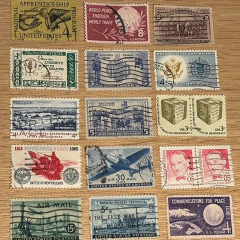Samling med brukte norske frimerker merket «NOREG» med ulike motiver. Loten inkluderer blant annet flere grønne frimerker med bygninger/landskapsmotiv, samt frimerker med folkemusikkmotiver som hardingfele, seljefløyte og lur. Ulike valører, blant annet 100, 125 og 750. Frimerkene er stempler og presentert på plansje, egnet for videre innsetting i album eller som supplement til eksisterende samling.