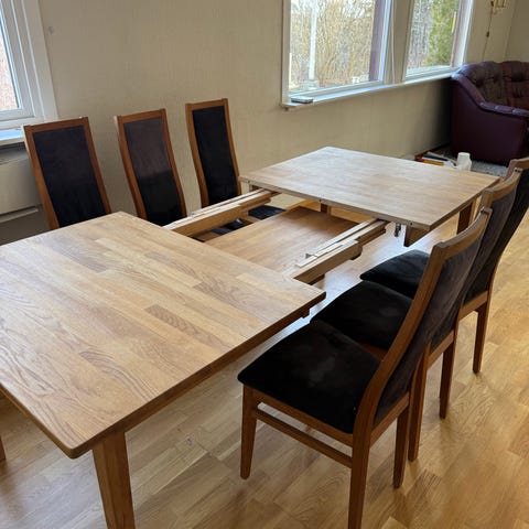 Selger fin spisestue i malt teak. Består av bord, 6 stoler og skjenk. En stol har skade. Bord er 120 cm . To ileggsplater følger med ( teak- ikke malt). Skjenk er 202cm. Har synlige bruksmerker. Må hentes raskt da nye møbler skal inn! Må hentes på Lund i Kristiansand.