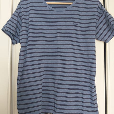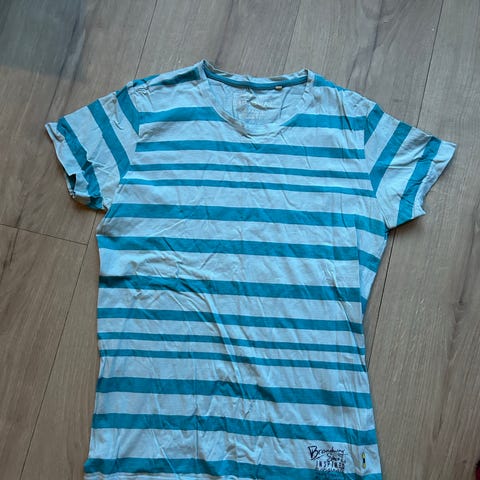Bondelid t-skjorte for herre i størrelse S. T-skjorten er laget av bomull og har brede horisontale striper i hvitt og lyseblått. Kortermet modell med rund hals og liten Bondelid-logo brodert på brystet. Passer til hverdagsbruk.