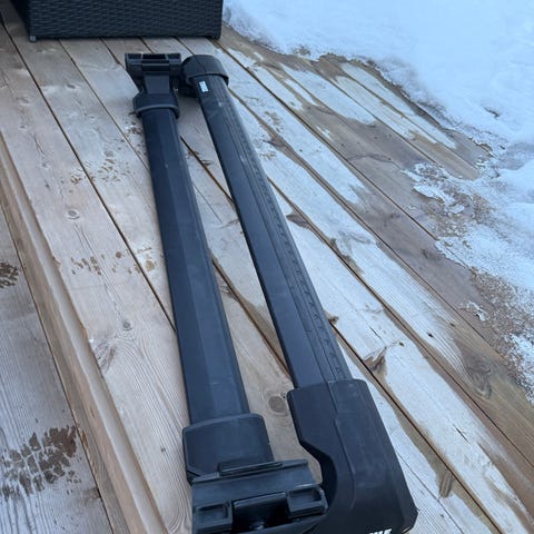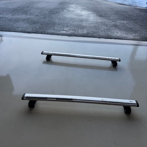 Dette er EN bøyle med tilhørende føtter og monteringskit. Kjøpte to sett for å ha tre bøyler på taket. Selger den som er til overs.