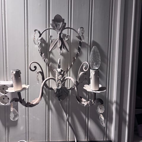 4 store og en litt mindre vegg lampettene. Glass skjerm og brun rustikk ramme. Selges samlet til førstemann som henter.