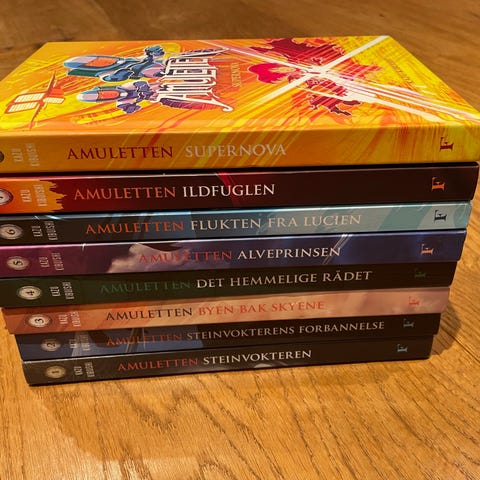 Fontini Amuletten Fortsettelsen innbundet tegneserie som samler bok 4, 5 og 6 i Amuletten-serien. Boken er på norsk og utgitt av Fontini forlag. Innbundet utgave med fargeillustrasjoner gjennom hele boken. Passer som lesestoff for barn og unge som liker fantasy og grafiske romaner.