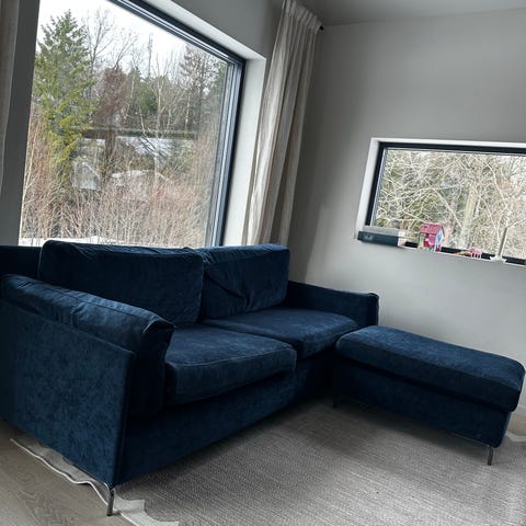 Pent brukt sofa selges på bakgrunn av flytting. Sofa er ikke brukt den siste tiden da den er liten ifht. ny stue. Sofaen og puff er kjøpt fra SofaCompany i mørkeblå fløyel. Selges samlet og må hentes. Vi har hund og katt, dog bruker ikke de dette. Sofaen mål er: H 83 cm x B 218 cm x D 89cm. Puff mål er: H 46 cm x B 82 cm x D 60 cm. Puff er ikke festet fast og kan flyttes ved behov.