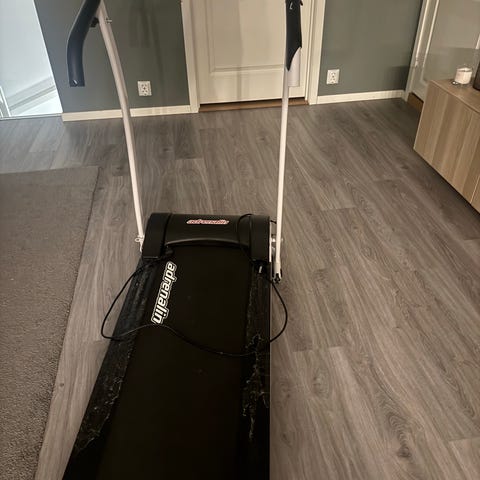Pro-Form 480 CX tredemølle i svart. Elektrisk tredemølle med konsoll foran løpebåndet og sammenleggbar konstruksjon for enklere oppbevaring. Egnet til innendørs gange og lett til moderat løpetrening. Den kubbet nylig og vil ikke på.