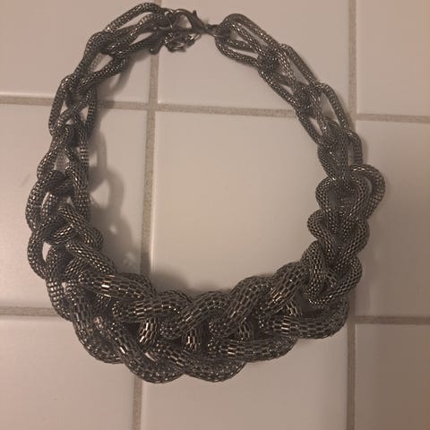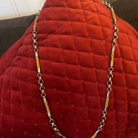 Kjedet er i veldig god stand. Det har lenker i metall i sort, sølvfarge, gullfarge og svart, og en bord i svart lær. Låsen er veldig pent utsmykket og kan brukes i front eller på baksiden.