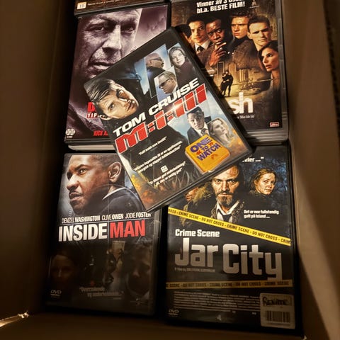 Samling med diverse DVD-filmer i blandet sjanger. Bildet viser flere ulike titler i original DVD-omslag. Passer for deg som ønsker en pakke med forskjellige filmer på DVD-format. Antall titler og eksakte filmer fremgår ikke fullt ut av bildet og kan variere etter hva som følger med i samlingen.