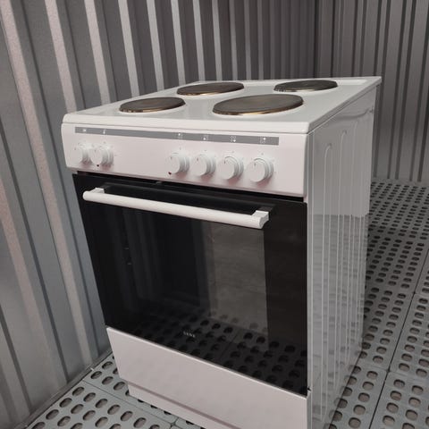 Komfyren har tre kokeplater på toppen med separate brytere i front. Stekeovnen har langpanne, rist og stekebrett.