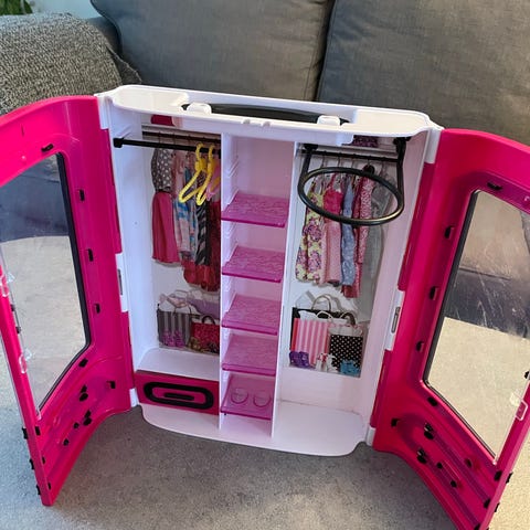 Barbie klesskap med flere hyller, skuffer og klesstang for oppbevaring av dukketøy. Settet inkluderer blant annet to kjoler, flere kleshengere, sko, vesker og smykker som tilbehør til Barbie-dukker. Klesskapet har bærehåndtak på toppen, og er egnet til organisering og oppbevaring av klær og tilbehør til Barbie-dukker.