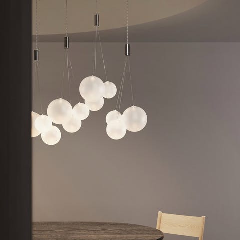 Drop Bulb taklampe fra 101 Copenhagen er en skulputurell taklampe i messing. Den har åtte fleksible armer, 14 jsuterbare ledd og åtte opale glasskuler. Teksturen i metallet gir en ekstra dybde. Et kult blikkfang over et avlangt spisebord eller som smykke i et stort rom. Hos oss henger det i trappa.