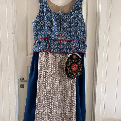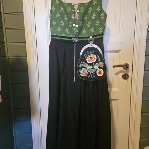 Grønn trønderbunad selges med sølv, veske og kyse. Bunaden er kjøpt brukt av min mor. Tidligere eier har klipt opp ryggen på skjorta. Denne er nå sydd (se bilde) og dette vises ikke under vesten. Skjørt og vest og forkle er sydd sammen men kan lett løsnes. Mye stoff å gå på for tilpasning. Passer ved ca 170 cm høyde.