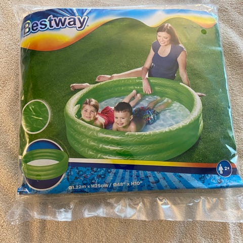 Bestway barnebasseng, rund modell i flerfargede ringer. Bassenget har oppblåsbare sider og myk, strukturert bunn. Størrelse ca. 61 x 22 cm, egnet for små barn (fra 2 år og oppover, ifølge emballasjen). Laget i slitesterk PVC/plast, beregnet for bruk utendørs på jevnt underlag. Fylles med vann tilpasset barnets høyde og brukes under tilsyn av voksen.