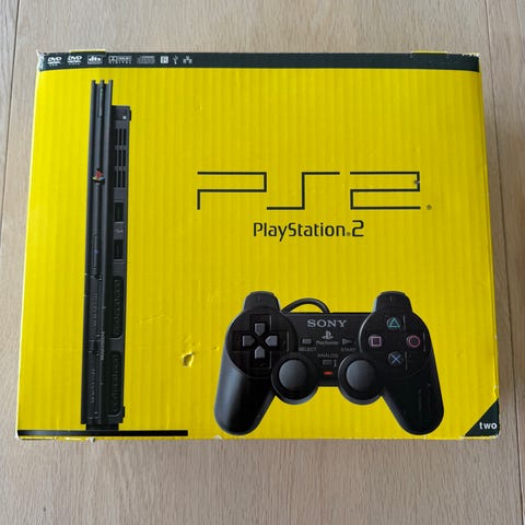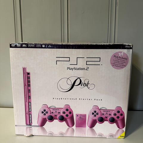 Følger med to rosa kablede kontrollere. Egnet for avspilling av PlayStation 2-spill og DVD-filmer, med tilkobling til TV via kompatibel videokabel og strømtilkobling via ekstern strømforsyning.