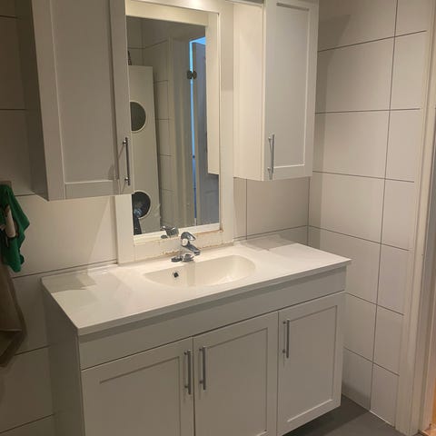 Baderomsinnredningen vil bli skrudd ned fra vegg når rørlegger kommer og stenger/blender vannrør. Det vil bli gjort i løpet av mars måned.