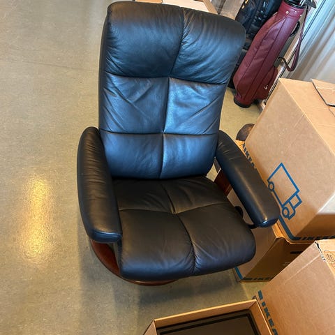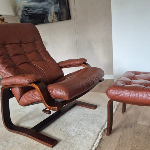 Retro samanleggbar lenestol produsert av Norske Ekornes og designet av Per Leiv Øie. Brunt skinn. God sittekomfort og en praktisk sammenleggbar konstruksjon. Fint eksemplar med få bruksmerker, enkel å plassere.