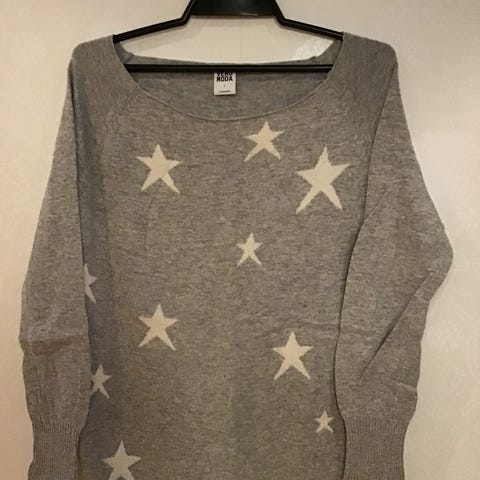 Grå genser med stjerne fra Hunkydory i størrelse XS-oversize modell som også passer størrelse S. Omkrets bryst/liv er 116 cm, lengde 64 cm. Laget av en blanding av lammeull,angora og nylon. Pent brukt uten flekker eller skader.
