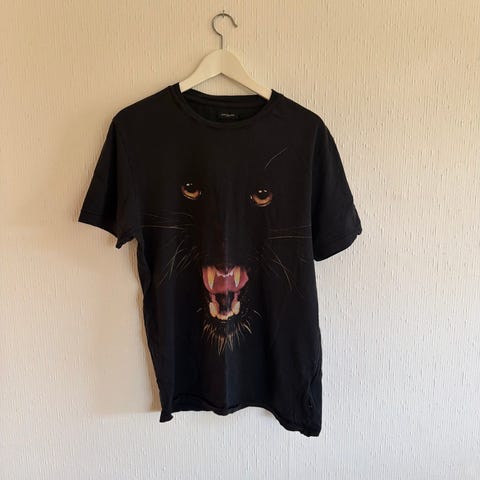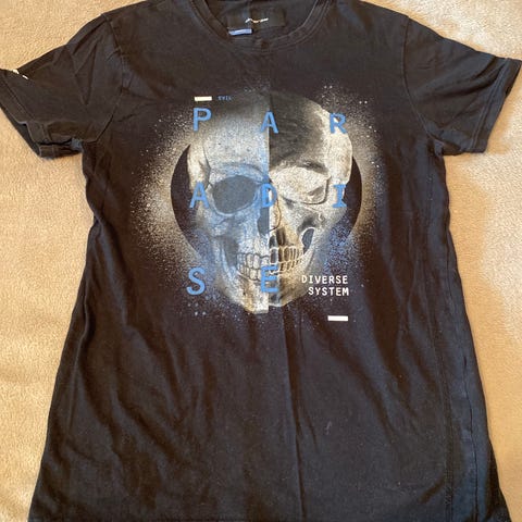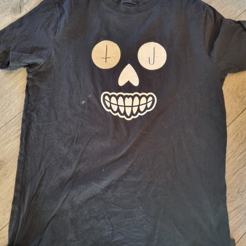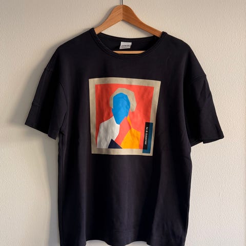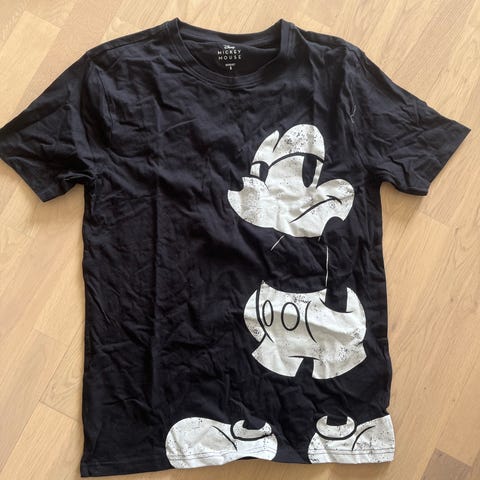 Sort t-skjorte med rund hals og klassisk passform. Stort trykk foran med kjent tegneseriefigur i sort/hvitt. Myk og behagelig i bruk – passer fint til hverdag. Ma liten flekk foran (se bilde). Ellers pent brukt.