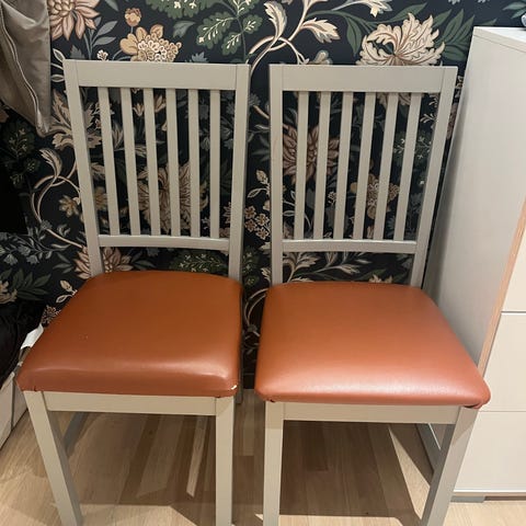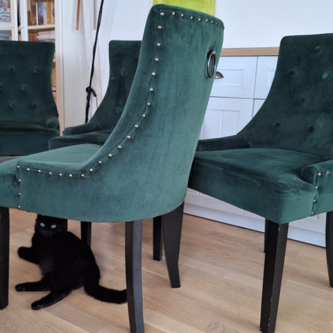 Fine grønne stoler selges billig på grunn av merker fra katt og flytting.