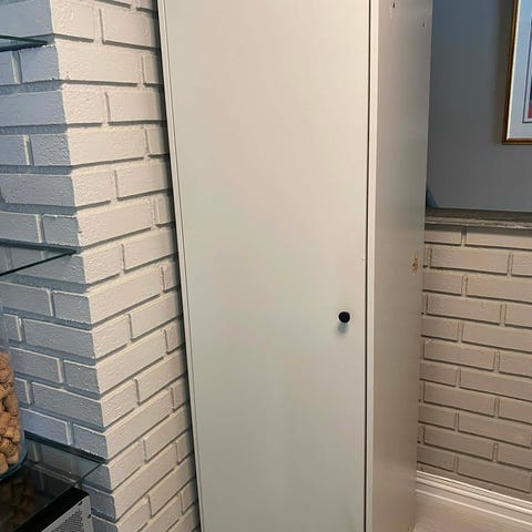 Skap, dør og håndtak gis bort samlet. Skapet har blitt brukt til oppbevaring av støvsuger, rengjøringsutstyr og husholdningsprodukter.