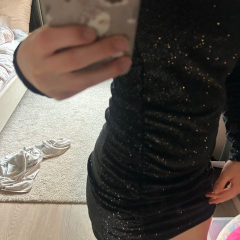 Zara festkjole for dame i størrelse S. Kjolen er svart med glitrende effekt. Den har tettsittende passform, kort lengde og tynne stropper som krysser i ryggen. Egnet til fest og andre anledninger der man ønsker en enkel, figurnær kjole.