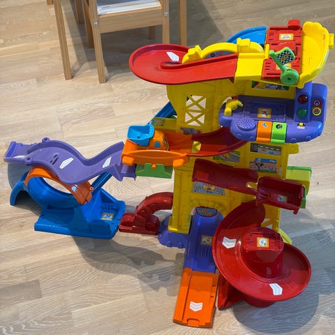 Fisher-Price bilbane lekesett i plast. Lekesettet består av en vertikal bane med flere røde nedfarter og ramper, gul bakvegg og grå base. Passer til små lekebiler som kan kjøres fra toppen og ned gjennom de ulike løypene. Egnet som innendørs lek for barn som liker biler og baner.