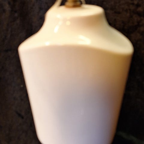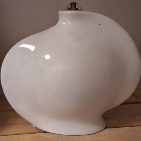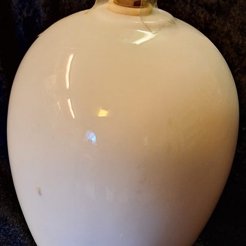 Hvit rund bordlampe med 3 ben og skrue til å feste pereholder og skjerm til.