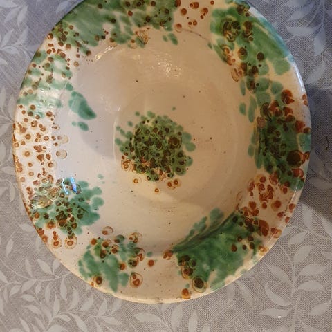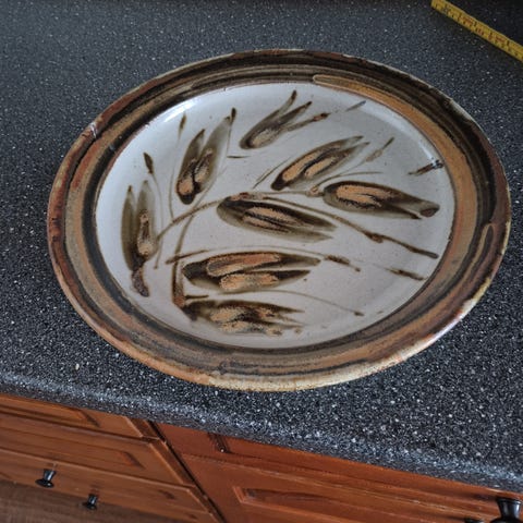 Keramikk bolle i håndlaget stil med glasur i beige og brune toner. Bollen har dekorative penselstrøk på innsiden og utsiden. Diameteren er omtrent 25 cm, egnet til servering av salater, frukt eller andre retter, eller som dekorasjonsgjenstand. Undersiden har enkel signatur/merke fra keramiker.