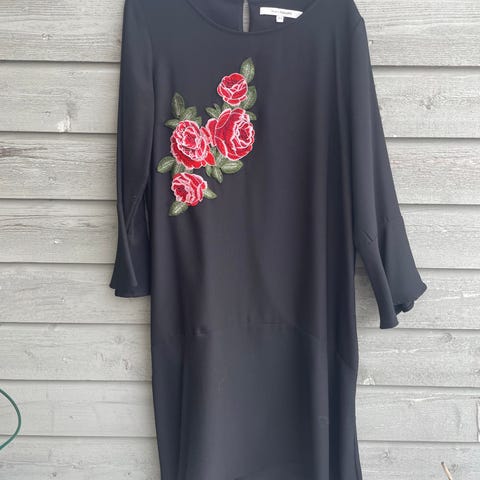 KappAhl festkjole for dame i størrelse 40. Kjolen er svart og laget i polyester. Modellen er ermeløs med rund hals og har flere lag med volanger og frynser foran, mens baksiden er glatt. Lengden går omtrent til over kneet, avhengig av høyde. Egnet som festkjole eller til andre anledninger der man ønsker en enkel, mørk kjole med dekorative detaljer.