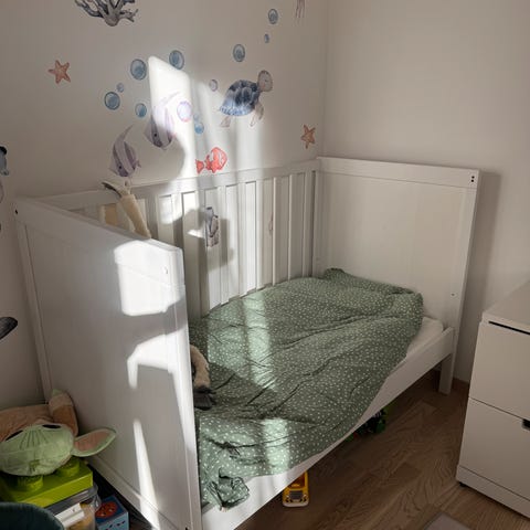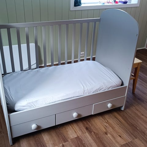 IKEA juniorseng med sengehest og oppbevaringsskuffer i grå utførelse. Sengen har ribbebunn og høy gavl. Under sengen er det integrerte skuffer som gir ekstra oppbevaringsplass til for eksempel sengetøy eller leker. Egnet som overgangsseng fra sprinkelseng til vanlig seng for barn.